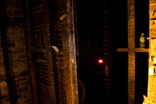 There is a strobe at back camera right, firing through slats in the burnt-out wall. This flash is appropriately geled "fire," and the slats create a cool effect when caught by the fog.